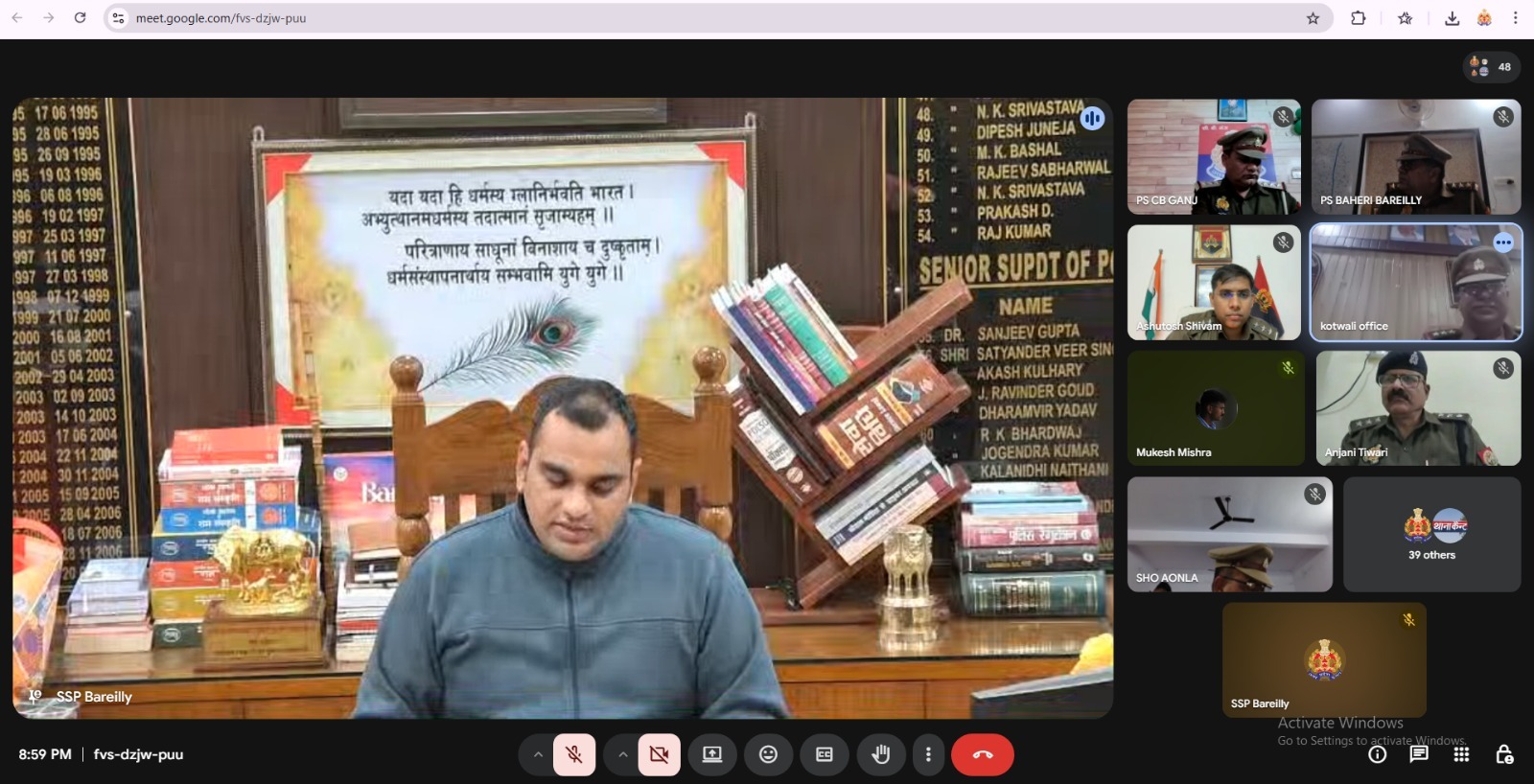 बरेली। अनुराग आर्य वरिष्ठ पुलिस अधीक्षक बरेली द्वारा डेली क्राइम, आगामी होली पर्व एवं अन्य महत्वपूर्ण बिंदुओं के संबंध में रात्रि 20:30 बजे से गूगल मीट के माध्यम से समीक्षा गोष्ठी आयोजित की गई। गोष्ठी में जनपद के समस्त अपर पुलिस अधीक्षकगण, क्षेत्राधिकारी (COs), क्षेत्राधिकारी एलआईयू तथा सभी थाना प्रभारी