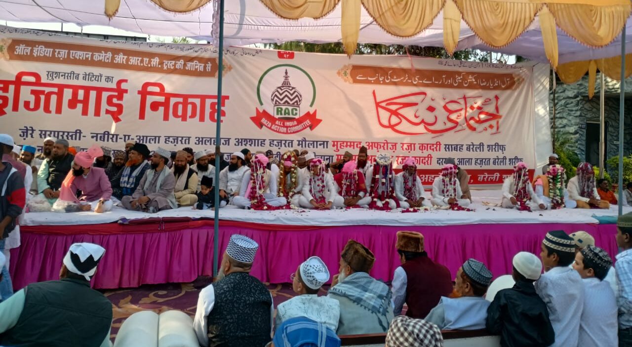 बरेली। ऑल इंडिया रज़ा एक्शन कमेटी और आरएसी ट्रस्ट की जानिब से आज 11 ख़ुशनसीब बेटियों का इज्तिमाई निकाह कराया गया। शरीअत की पाबंदी के साथ सजाई गई इस मुबारक महफ़िल में दूल्हों और दुल्हनों के घरानों से आए मेहमान भी शरीक हुए। महफ़िल की सरपरस्ती नबीरा-ए-आला हज़रत अफ़रोज रज़ा क़ादरी साहब ने फ़रमाई। नबीरा-ए-आला हज़रत व आऱएसी के राष्ट्रीय अध्यक्ष मौलाना अदनान रज़ा क़ादरी ने सभी जोड़ों के निकाह पढ़ाए।