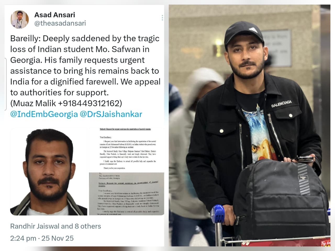 वह अब एमबीबीएस के अंतिम वर्ष में थे और भारत लौटने की योजना बना रहे थे। बह वर्तमान में जॉर्जिया की सेंट्रल यूनिवर्सिटी ऑफ़ यूरोप में एमबीबीएस अंतिम वर्ष के छात्र थे। इस मामले में छात्र असद अंसारी ने भी सरकार से जल्द से जल्द शव भारत लाने की मांग की है। परिवारजनों ने भारत सरकार से अपील करते हुए कहा है कि उनके बेटे का शव जल्द से जल्द भारत वापस लाने में मदद करे, ताकि वे उसे सम्मानपूर्वक अंतिम विदाई दे सकें।